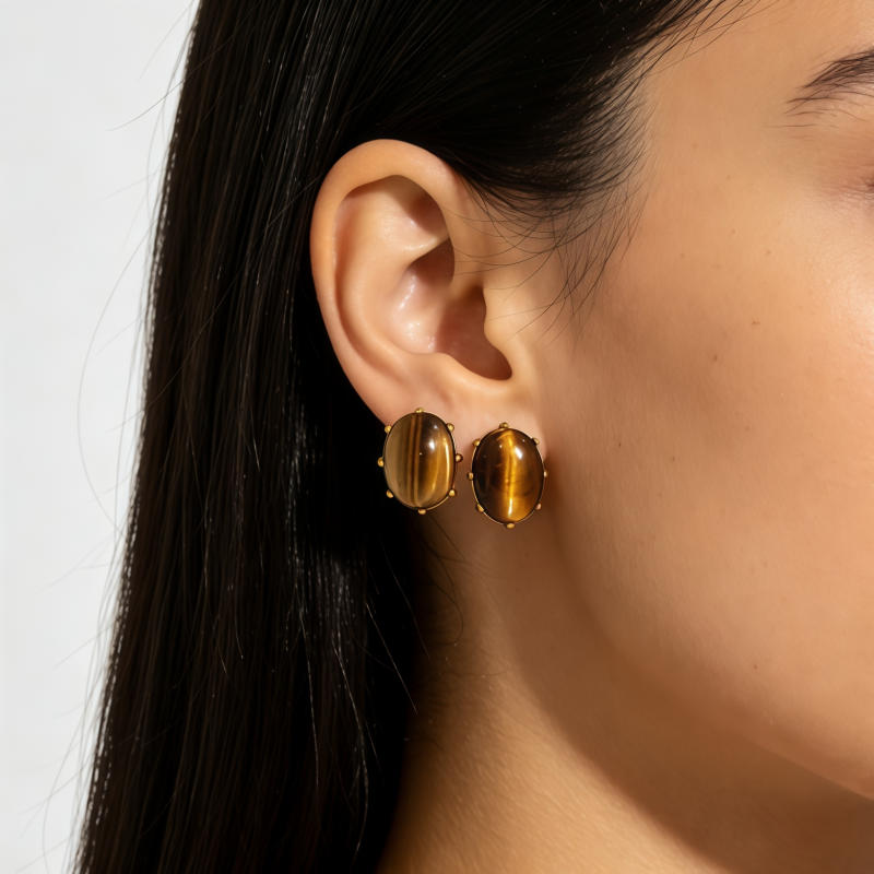 Increase quantity for YELLOW TIGER'S EYE STUD EAR/GOLD